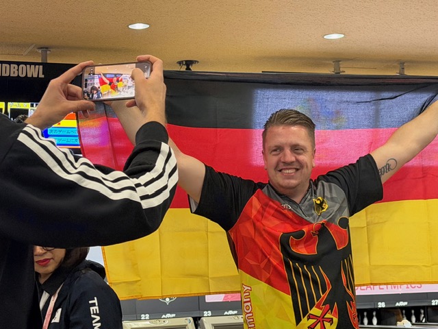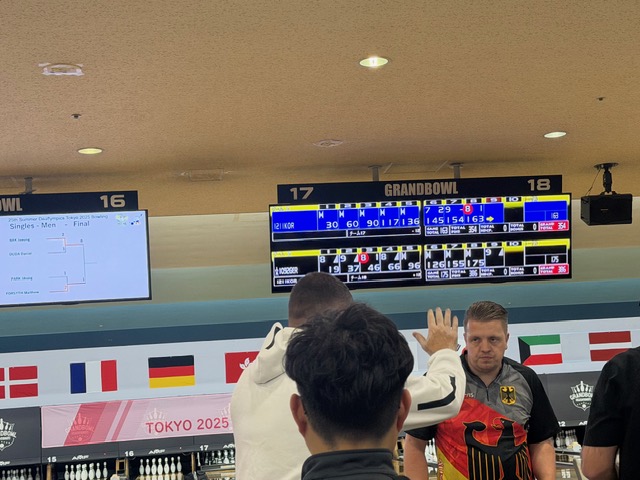 東大和市ビッグボックスにボウリングシングル決勝を見に行きました! 韓国VSドイツ 2勝先勝でしたが2:1でドイツが優勝 金メダルを獲得したFORSYTH Matthewさん。ずいぶん身近なところでの決勝戦を見れてゴキゲンです!